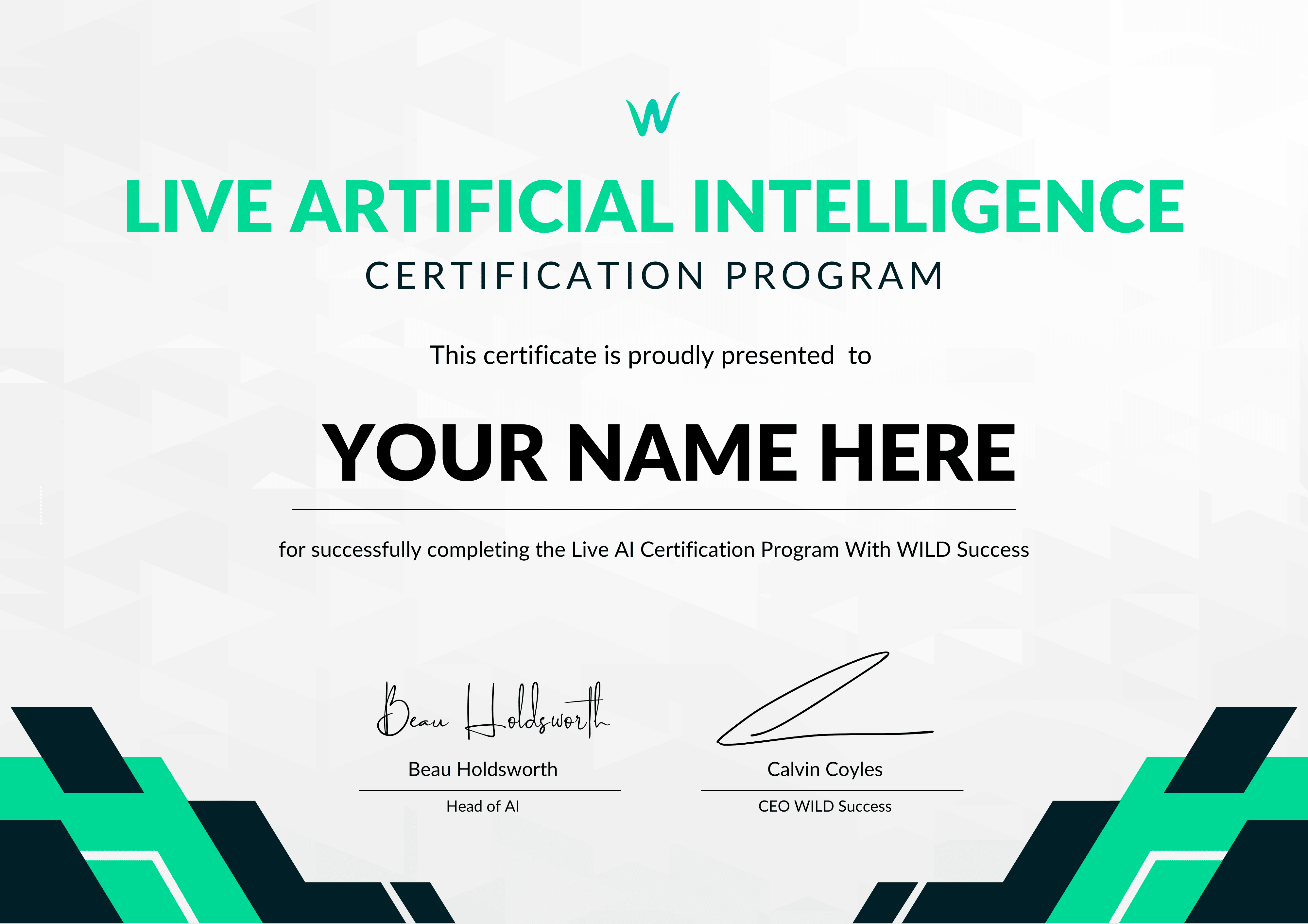 Through structured video sessions, live trainings, and hands-on exercises, you will learn how to use AI tools and systems to reduce manual effort, streamline workflows, and create smarter ways of working in your business or career. Whether you are completely new to AI or ready to move beyond basic prompts, this certification gives you practical foundations you can apply immediately.